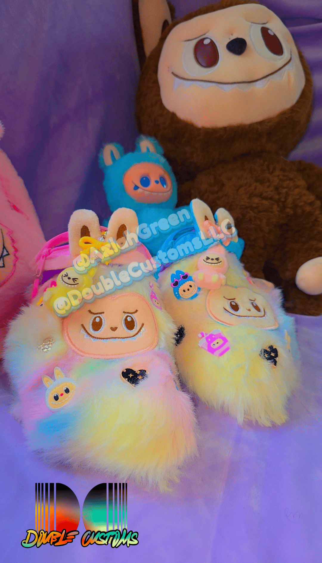 💥 LIMITED EDITION DROP! 💥 These slides are handmade from scratch and one of a kind each pair is custom-designed with rainbow plush fur, bunny ears, zipper pouches, and exclusive monster charms! Perfect for cozy days, cute fits, or content-ready drip.